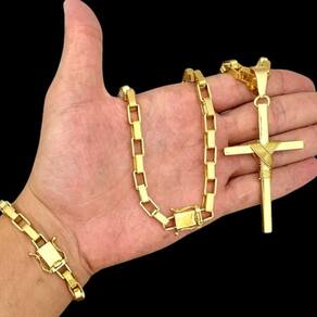 Kit Tijolinho 10mm + Cruz Amarrada Banhado a Ouro 18K Detalhes do Produto: Material: ligas metálicas de alta qualidade, especialmente tratadas para fixação e absorção do ouro, com acabamento em verniz protetor. Aparência: visual idêntico ao ouro maciço. Produção: artesanal, com atenção meticulosa aos detalhes. Banho: 10 camadas espessas de ouro 18k, finalizadas com verniz antialérgico . Elos: soldados varia conforme o modelo . Pedras: zircônias brilhantes cravejadas quando aplicável . Tamanhos Disponíveis: Cordões Masculinos: 70cm padrão e 60cm sob consulta/Pedido Via Chat . Cordões Femininos: 50cm padrão e 45cm sob consulta/Pedido Via Chat . Pulseiras: 21cm padrão ; tamanhos de 18cm a 23cm sob consulta/Pedido Via Chat. Pingentes: conforme imagens; consulte para mais detalhes via chat. Espessuras Recomendadas para Cordões / Pingentes: P: 1mm a 4mm M: 4mm a 8mm G: 6mm a 13mm Gg: 12mm a 18mm Incluso na Compra: Saquinho de organza para armazenamento seguro. Caixa elegante, perfeita para presente. Cupom de desconto para a próxima compra. Flyer com outros produtos da coleção. Carta de agradecimento personalizada. Adesivo da marca ToJoia18k. Informações Adicionais: : 6 meses termos acompanham o produto . Devolução: 7 dias para devolução sem questionamentos. Envio: despacho em até 24 horas úteis após confirmação do pagamento. Cuidados com a Peça: Evite contato com produtos químicos; aguarde o perfume secar antes de usar. Evite contato com shampoo, condicionadores e suor excessivo. Armazene em local seco, preferencialmente no saquinho de organza fornecido. Uso no mar e piscina é permitido; lave com água corrente e sabão neutro após. Por que Escolher a ToJoia18k Semi-joias luxuosas que combinam estilo, qualidade e sofisticação. Banho espesso de ouro 18k, garantindo brilho duradouro e acabamento impecável. Design exclusivo e produção artesanal, perfeitos para qualquer ocasião. Materiais premium que asseguram durabilidade. Ao escolher uma semi-joia ToJoia18k, você investe em qualidade, elegância e uma experiência única. Aguardamos sua compra Observação: pode ocorrer variação no fecho raramente . Imagens reais, sem edição. Qualquer dúvida, estamos à disposição para esclarecimentos.