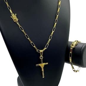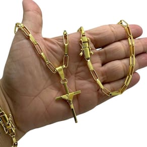 Kit Tijolinho 6mm + Cruz Fio - Banhado a Ouro Detalhes do Produto: Material: ligas metálicas de alta qualidade, especialmente tratadas para fixação e absorção do ouro, com acabamento em verniz protetor. Aparência: visual idêntico ao ouro maciço. Produção: artesanal, com atenção meticulosa aos detalhes. Banho: 10 camadas espessas de ouro 18k, finalizadas com verniz antialérgico . Elos: soldados varia conforme o modelo . Pedras: zircônias brilhantes cravejadas quando aplicável . Tamanhos Disponíveis: Cordões Masculinos: 70cm padrão e 60cm sob consulta/Pedido Via Chat . Cordões Femininos: 50cm padrão e 45cm sob consulta/Pedido Via Chat . Pulseiras: 21cm padrão ; tamanhos de 18cm a 23cm sob consulta/Pedido Via Chat. Pingentes: conforme imagens; consulte para mais detalhes via chat. Espessuras Recomendadas para Cordões / Pingentes: P: 1mm a 4mm M: 4mm a 8mm G: 6mm a 13mm Gg: 12mm a 18mm Incluso na Compra: Saquinho de organza para armazenamento seguro. Caixa elegante, perfeita para presente. Cupom de desconto para a próxima compra. Flyer com outros produtos da coleção. Carta de agradecimento personalizada. Adesivo da marca ToJoia18k. Informações Adicionais: : 6 meses termos acompanham o produto . Devolução: 7 dias para devolução sem questionamentos. Envio: despacho em até 24 horas úteis após confirmação do pagamento. Cuidados com a Peça: Evite contato com produtos químicos; aguarde o perfume secar antes de usar. Evite contato com shampoo, condicionadores e suor excessivo. Armazene em local seco, preferencialmente no saquinho de organza fornecido. Uso no mar e piscina é permitido; lave com água corrente e sabão neutro após. Por que Escolher a ToJoia18k Semi-joias luxuosas que combinam estilo, qualidade e sofisticação. Banho espesso de ouro 18k, garantindo brilho duradouro e acabamento impecável. Design exclusivo e produção artesanal, perfeitos para qualquer ocasião. Materiais premium que asseguram durabilidade. Ao escolher uma semi-joia ToJoia18k, você investe em qualidade, elegância e uma experiência única. Aguardamos sua compra Observação: pode ocorrer variação no fecho raramente . Imagens reais, sem edição. Qualquer dúvida, estamos à disposição para esclarecimentos. Marca: Não Informado