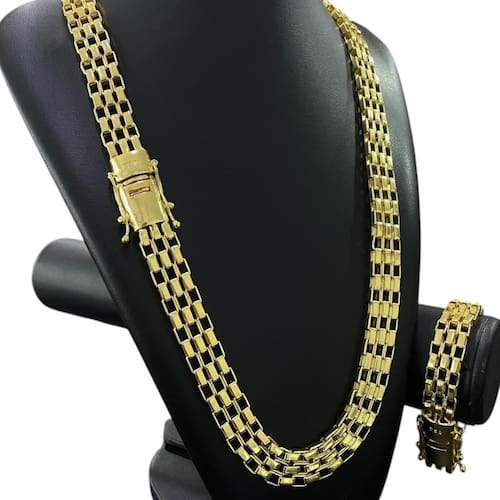 Kit Tijolinho Duplo Banhado a Ouro 18K Detalhes do Produto: Material: ligas metálicas de alta qualidade, especialmente tratadas para fixação e absorção do ouro, com acabamento em verniz protetor. Aparência: visual idêntico ao ouro maciço. Produção: artesanal, com atenção meticulosa aos detalhes. Banho: 10 camadas espessas de ouro 18k, finalizadas com verniz antialérgico . Elos: soldados varia conforme o modelo . Pedras: zircônias brilhantes cravejadas quando aplicável . Tamanhos Disponíveis: Cordões Masculinos: 70cm padrão e 60cm sob consulta/Pedido Via Chat . Cordões Femininos: 50cm padrão e 45cm sob consulta/Pedido Via Chat . Pulseiras: 21cm padrão ; tamanhos de 18cm a 23cm sob consulta/Pedido Via Chat. Pingentes: conforme imagens; consulte para mais detalhes via chat. Espessuras Recomendadas para Cordões / Pingentes: P: 1mm a 4mm M: 4mm a 8mm G: 6mm a 13mm Gg: 12mm a 18mm Incluso na Compra: Saquinho de organza para armazenamento seguro. Caixa elegante, perfeita para presente. Cupom de desconto para a próxima compra. Flyer com outros produtos da coleção. Carta de agradecimento personalizada. Adesivo da marca ToJoia18k. Informações Adicionais: : 6 meses termos acompanham o produto . Devolução: 7 dias para devolução sem questionamentos. Envio: despacho em até 24 horas úteis após confirmação do pagamento. Cuidados com a Peça: Evite contato com produtos químicos; aguarde o perfume secar antes de usar. Evite contato com shampoo, condicionadores e suor excessivo. Armazene em local seco, preferencialmente no saquinho de organza fornecido. Uso no mar e piscina é permitido; lave com água corrente e sabão neutro após. Por que Escolher a ToJoia18k Semi-joias luxuosas que combinam estilo, qualidade e sofisticação. Banho espesso de ouro 18k, garantindo brilho duradouro e acabamento impecável. Design exclusivo e produção artesanal, perfeitos para qualquer ocasião. Materiais premium que asseguram durabilidade. Ao escolher uma semi-joia ToJoia18k, você investe em qualidade, elegância e uma experiência única. Aguardamos sua compra Observação: pode ocorrer variação no fecho raramente . Imagens reais, sem edição. Qualquer dúvida, estamos à disposição para esclarecimentos. Marca: Não Informado
