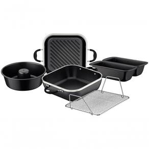 - Grelha de aço inox;- É possível assar, cozinhar, fritar e descongelar;- Tampa grill de alumínio com espessura de 7 mm; - Corpo de alumínio forjado com espessura de 7 mm; - Revestimento interno e externo de antiaderente Starflon High Performance e livre de PFOA;- Alças em aço inox com proteção de silicone oferecendo maior durante o uso.- Formas para pão e bolo com revestimento interno e externo de antiaderente Starflon Max e livre de PFOA;- Forma para bolo com com revestimento interno e externo de antiaderente Starflon Premium que não gruda, é fácil de limpar, mais durável, não é prejudicial à saúde e é livre de PFOA.- Pode ir à máquina de lavar louças, porém, para maior durabilidade do produto, indicamos lavar manualmente. - Foto meramente ilustrativa.
