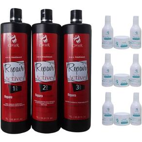 Repair active passo 1 Shampoo S.O.S. Treatment Composto de omega active 3d da proteina da cacau maçã + proteina da soja. Indicação: para cabelos rebeldes, indisciplinados e desalinhados. Resultado: cabelos lisos protegidos contra a umidade, redução de frizz e brilho3d. O shampoo repair active foi desenvolvido com uma poderosa e exclusiva fórmula que combina proteina da soja, responsável pelo selamento das cutículas abertas e danificadas possui poderosa ação hidratante, amaciante e nutritiva proporcionada pela de cacau, aliada a ativos com propriedade de proteção e restauração. É um sistema inovador que cria uma superfície suave e sedosa sobre os cabelos, mantendo as fibras capilares e fios rebeldes mais alinhados, brilhantes e disciplinados. Promove uma limpeza suave do couro cabeludo para o inicio do processo de alinhamento dos fios e alisamento da textura. Para ter cabelos ainda mais lisos e disciplinados, utilize outros produtos da linha cavier cosmeticos. Modo de usar: com os cabelos úmidos, aplique o shampoo repair active massageie até formar espuma abundante enxague e repita a operação. Em seguida aplique o reconstrutor repair active. === Repair active passo 2 Reconstrutor S.O.S. Treatment Elimina o frizz. Amaciante e ultra hidratante. Sem adição de corantes, possui ação pós progressiva, pos quimica indicação: cabelos transformados quimicamente resultado: cria um filme protetor anti umidade. Proporciona brilho e maciez de longa duração. O reconstrutor repair active foi desenvolvido a partir de um complexo reconstrutor. queratina, creatina, de cacau e óleo de abacate . Possui filtro solar e silicones especiais auxilia na reconstrução dos fios com aspecto poroso e quebradiço, reduzindo as pontas duplas, eliminando o frizz e revestindo a fibra com um escudo anti umidade de longa duração. Devolve o aspecto natural, promove maciez e brilho 3d aos cabelos. Modo de usar: aplique nos cabelos úmidos e higienizados uma pequena quantidade do comprimento as pontas. Penteie não enxágue . Se desejar, em seguida, inicie processo de escova ou prancha. === Repair active passo 3 Mascara S.O.S. Treatment Produto cosmético. Mascara condicionante repair active é o terceiro passo do processo da escova progressiva e outras químicas de transformação. Sua fórmula sem sal e com ph baixo, nutre e hidrata profundamente os cabelos, uniformizando estrutura cuticular e mantendo o efeito liso da escova progressiva por muito mais tempo. Desenvolvida especialmente com omegaactive 3d da proteínada de cacau e nutrientes vitais para a restruturação completa dos cabelos alisados, escovados, fragilizados por tinturas, relaxamentos e outros processo químicos. Age diretamente na fibra capilar, devolvendo aos fios brilho intenso e textura suave e macia, prolonga o efeito liso, tratando completamente os fios. Modo de usar: deixe o cabelo voltar à temperatura ambiente. Enxágue bem com água em abundância. Aplique a máscara condicionante repair active, massagens intensivamente e aguarde 3 minutos. Enxágue. Finalize como desejar.