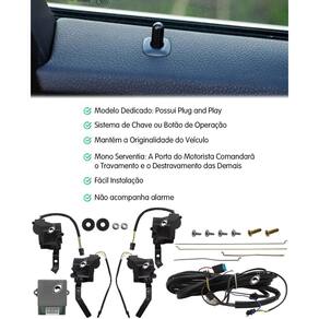 ESPECIFICAÇÃO TÉCNICA: - Modelo Dedicado; - Sistema de Chave ou Botão de Operação; - Mantém a Originalidade do Veículo; - Toque Elevado e Motor de Baixo Ruído; - Mono Serventia: A Porta do Motorista Comandará o Travamento e o Destravamento das Demais; - Não Possui Travamento Automático; - Permite ao Transmissor do Sistema de Alarme o Fechamento e o Destrave das Portas Remotamente ao Armar u Desarmar-se; - Fácil Instalação; - Corrente Contínua de 12V - Terra Negativo. OBS: Não acompanha Alarme.
