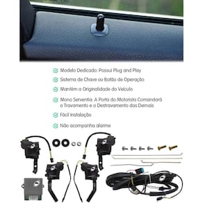 ESPECIFICAÇÃO TÉCNICA: - Modelo Dedicado; - Sistema de Chave ou Botão de Operação; - Mantém a Originalidade do Veículo; - Toque Elevado e Motor de Baixo Ruído; - Mono Serventia: A Porta do Motorista Comandará o Travamento e o Destravamento das Demais; - Não Possui Travamento Automático; - Permite ao Transmissor do Sistema de Alarme o Fechamento e o Destrave das Portas Remotamente ao Armar u Desarmar-se; - Fácil Instalação; - Corrente Contínua de 12V - Terra Negativo. OBS: Não acompanha Alarme.