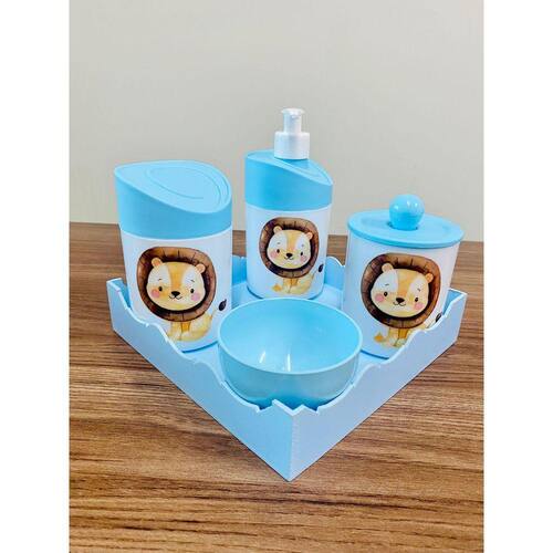 Kit Organizador para bebê c/bandeja em MDF. Cor do Pote: BRANCO PADRÃO Tampas: AZUL MATERIAL DOS POTES: ACRÍLICO MATERIAL DA BANDEJA: MDF Kit acompanha: - 1 bandeja de madeira em MDF. - 1 porta sabonete / álcool gel - 1 molheira - 1 porta algodão - 1 porta cotonete MEDIDAS DA BANDEJA EM MDF: Diâmetro: 19,5x19 cm Altura: 5x8cm MEDIDA DOS POTES: Porta algodão/cotonete: 8x10,5 cm Porta sabonete líquido: 12x21 cm Molheira: 8x5 cm Marca: Doya Kids