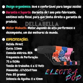 Kit Trio Electra POP com Fonte Aurora Trio Tattoo Tatuagem Cor: Preto Apresentamos o Kit Trio Electra POP, um conjunto completo de alta qualidade projetado para tatuadores profissionais que buscam aprimorar suas habilidades artísticas e proporcionar resultados excepcionais aos seus clientes. Com a poderosa Máquina Electra POP e a avançada Fonte de Alimentação Aurora, esse kit oferece a combinação perfeita de desempenho, precisão e confiabilidade para uma experiência de tatuagem única.Máquina Electra POP - Especificações:- Indicação: Recomendada tanto para tatuadores iniciantes quanto experientes, a Electra POP é versátil e ideal para realizar traços precisos e sombreamentos suaves com facilidade. - Faixa de Voltagem Recomendada: A Electra POP opera entre 4v e 12v, permitindo ajustes precisos de voltagem para se adequar a diferentes técnicas e estilos de tatuagem. - Velocidade Máxima: Com uma velocidade máxima de 10.000 RPM, a Electra POP oferece um desempenho potente, garantindo linhas nítidas e preenchimentos eficientes. - Conexão: A máquina possui conexão RCA, proporcionando uma conexão segura e estável com a fonte de alimentação. - Curso da Batida: Com um curso de 3,5mm, a Electra POP proporciona uma sensação suave e confortável durante o uso. - Material do Chassi: Construída com alumínio de aviação, a máquina é leve e durável, garantindo alta resistência e longa vida útil.Fonte Aurora - Especificações:- Display Digital: Permite ajustar a voltagem de forma precisa, variando de 4v a 18v, em incrementos de 0.1v. - Função de Memória: A Fonte Aurora possui memória interna que armazena as configurações utilizadas anteriormente. - Pedal Integrado: Possui um pedal inteligente, dispensando a necessidade de um pedal externo. - conexão: rca - Voltagem de Entrada: Bivolt 110v - 240v - Material: Liga de Alumínio - Dimensões: Aproximadamente 11,5 cm x 7,5 cm x 2,5 cm - Peso: Aproximadamente 140g Acompanha os seguintes acessórios: 1. fonrte Aurora 2 - Permite ajustar a voltagem de forma precisa, variando de 4v a 18v, em incrementos de 0.1v. 2.Pedal Inox - Cabo Silicone P10: O pedal de acionamento em aço inoxidável oferece respostas rápidas e precisas à Máquina ELECTRA POP, enquanto o cabo de silicone garante durabilidade e flexibilidade durante o uso. 3.Cabo RCA Silicone: O cabo RCA de silicone permite uma conexão segura e estável entre a Máquina ELECTRA POP e a Fonte de Alimentação AURORA 2, assegurando um funcionamento confiável. Observações Importantes: - Nosso tempo de processamento e envio é de 24h. - Caso queira podemos trocar a cor dos objetos. - Conte com nosso suporte para esclarecer qualquer dúvida Marca: Eletric ink