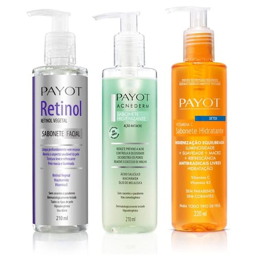 Kit trio sabonetes payot Kit trio sabonetes payot, contém: 1- sabonete líquido detox vitamina c payot 220ml Ação ou benefício: proporciona higienização equilibrada, desintoxicante, trazendo luminosidade, suavidade, maciez e refrescância. 1- sabonete higienizante acnederm payot O sabonete higienizante acnederm payot, foi formulado com ácido salicílico, niacinamida e óleo de , que conferem limpeza profunda eliminando as impurezas, sem irritar ou ressecar a pele. Controla a oleosidade excessiva, deixando a pele limpa e hidratada ao longo do dia. Desobstrui os poros. Diminui a vermelhidão e o inchaço causado pela acne. Seu uso contínuo ajuda na prevenção de formação de cravos e espinhas. Pele macia e com viço natural. Sensação refrescante. Livre de ingredientes de origem animal e não testado em animais. Sem corantes e parabenos. Não comedogênico. Dermatologicamente testado. Hipoalergênico. Vegano. Livre de ingredientes de origem animal e não testado em animais. 1-sabonete facial retinol payot O sabonete facial retinol payot limpa profundamente sem ressecar a pele. Sua fórmula revitalizante minimiza aoleosidade. Mantém a pele macia e iluminada ao longo do dia. A combinação de retinol vegetal, niacinamida e vitamina e ajuda a hidratar, proteger e promover a aparência de uma pele renovada. Possui uma textura leve e espuma cremosa. Produto livre de parabenos e corantes. Utilizamos um ativo de origem vegetal phyto-retinol , que não possui os efeitos adversos do retinol tradicional. Sem corantes e parabenos. Hipoalergênico. Dermartologicamente testado. Produto vegano. Não testado em animais.