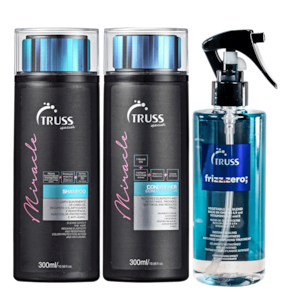 Kit com shampoo e 2 condicionadores para cabelos equilibrados. Truss Frizz Zero Miracle recupera a elasticidade, a resistência e proporciona maciez e brilho 3D, além de reparar intensamente.