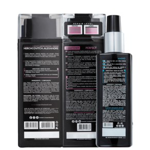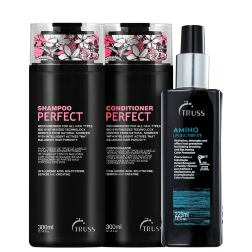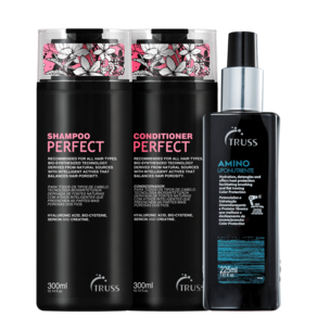 Kit com shampoo, condicionador e protetor térmico para todos os tipos de cabelo, principalmente os com frizz e ressecados. TRUSS Perfect Amino promove reparação de danos e protege de novas agressões.