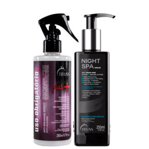 Kit com reconstrutor e sérum noturno para cabelos danificados. Truss Spa Obrigatório Plus+ possui um poderoso efeito antiquebra, atuando na reconstrução dos fios desde o seu interior.