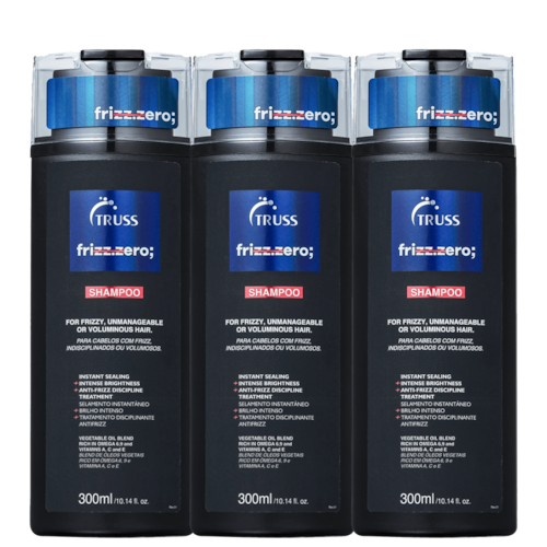 Kit com shampoos para cabelos com frizz. TRUSS Triple Shampoos Frizz Zero proporciona fios disciplinados e selados, com intenso brilho.