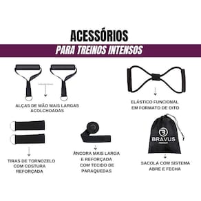 Kit Tubing Premium 12 Peças Elástico Extensor Bravus Sport Kit Tubing Premium 68kg 12 peças O Kit Tubing Premium 12 peças foi feito para os usuários mais exigentes e que buscam um produto de alta resistência para superar todos os limites e levar seu treino para outro nível. O elástico tubing antipressão é feito de material de qualidade premium, 100% látex reforçado, o que gera uma resistência dupla. Os mosquetões de aço inoxidável e as tiras firmemente costuradas também evitam o rasgo, mesmo sob a extrema resistência ao estiramento. O Kit Premium vem com 5 elásticos de borracha em forma de tubo duplamente reforçados, feitos de látex natural e resistência. Por serem feitos com látex 100% natural, possuem o dobro de resistência e de elasticidade, por isso tem maior durabilidade que os demais tubings. Cada elástico tem 1,20 m de comprimento com garras em metal. O kit Inclui: 5 Elásticos Tubing em 100 % látex natural, gancho largos em aço e tira em tecido de paraquedas e costura reforçada, sendo:1 elástico de 4.5 kg de resistência1 elástico de 9 kg de resistência1 elástico de 13,6 kg de resistência1 elástico de 18,2 kg de resistência1 elástico de 22,6 kg de resistência2 alças de mão revestidas de espuma2 tiras para tornozelo1 âncora para colocar na porta1 bolsa em nylon 1 Elástico Extensor 8 Elástico Extensor Super 8Sua resistência permite isolar grupos musculares e trabalhar todo o corpo. Transforme seu corpo com exercícios de braço único e duplo super eficazes para o condicionamento total do corpo. O Elástico extensor 8 oferece resistência ao músculo e fornece os resultados que você procura. Prático e Versátil : Uma alternativa compacta de treinamento de resistência, o elástico extensor 8 é portátil, fácil de usar tanto em ambientes internos quanto externos.Uma ferramenta de exercício físico versátil, o Elástico Extensor Super 8 é excelente para exercitar a parte superior e inferior do corpo e pode ser aplicado na yoga e no pilates.