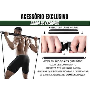 Kit Tubing Premium Extreme Elástico Extensor com Barra de Exercícios Bravus Sport O Kit Tubing Premium Extreme 95Kg agora vem com Barra de Exercício Bravus Sport Desenvolvido especialmente para os usuários mais exigentes e que buscam um produto premium, capaz de suportar treinos mais intensos e ajudar você a superar todos os limites Você pode criar mais de 50 combinações de carga, usando até 5 elásticos de diferentes resistências, feitos com látex 100% natural e acabamento diferenciado Os ganchos largos do Tubing Premium são feitos de aço preenchido e suas tiras de tecido de paraquedas são firmemente costuradas, evitando rasgos, mesmo sob a extrema tensão do estiramento. Seu kit ainda conta com a exclusiva Barra de Exercícios Bravus A Barra de exercícios Bravus é feita em aço de alta qualidade, tem 1,07m de comprimento total e suporta até 150 Kg de carga. Sua Barra de Exercício Bravus tem um encaixe que permite que ela seja conectada ou desconectada facilmente. Conecte 1 ou até 5 elásticos extensores do seu Kit Tubing Bravus nas extremidades da sua Barra e aumente o número de exercícios que podem ser executados com seu equipamento. O Kit Premium Extreme vem com 5 elásticos de borracha em forma de tubo duplamente reforçados, feitos de látex 100% natural. Cada elástico tem 1,20 m de comprimento com garras em metal de alto calibre e que permitem um treino muito mais potente. Finalidade: Ganho de força, resistência, aumento de massa magra, tonificação muscular e melhora de condicionamento físico O kit Inclui:1 elástico de 4.6 kg de resistência1 elástico de 9 kg de resistência1 elástico de 13.6 kg de resistência1 elástico de 27.2 kg de resistência1 elástico de 40.8 kg de resistência1 Barra de exercício feita em aço de alta qualidade2 alças de mão acolchoadas 2 tiras para tornozelo1 âncora para colocar na porta1 Sacola de transporte