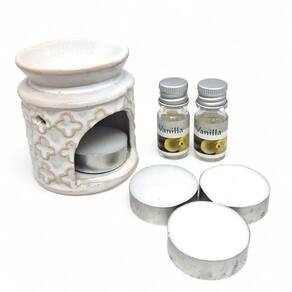 Essência de baunilha: 10ml Altura Turíbulo: 8 cm Largura Turíbulo: 6 cm Largura Vela: 4 cm