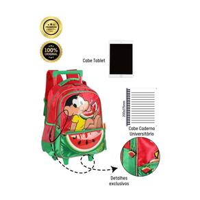 Kit escolar turma da monica mochila de rodinha + lancheira térmica + estojo triplo + garrafinha inox mochila de rodinha: Confeccionada em poliéster Fechamento em zíper Puxadores personalizados Compartimentos espaçosos 2 bolsos laterais para garrafa Possui rodas e alças de costas reguláveis e alça de mão Design exclusivo Medidas aproximadas: Altura: 45 cm Largura: 15 cm Comprimento: 30 cm