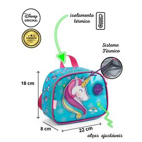 Lancheira Bolsa Térmica Unicórnio Basic - Produzida em poliéster; - Possui 1 bolso lateral 1 frontal e 1 divisão grande; - Forro interno em pvc; - Estampa estilizada; - Zíperes com puxadores reforçados; - Alça transversal removível; - Alça para mão; - Não Acompanha garrafinha e porta lanche ;