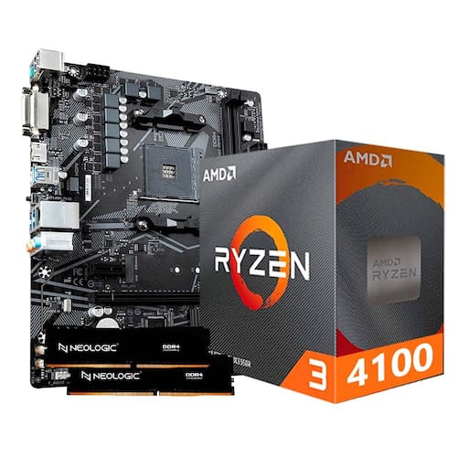 De um Upgrade na sua máquina com nossos Kits Neologic Upgrade e deixe sua maquina insana! O processador vai montado na placa mãe! Placa Mae A520 Am4 DDR4 Especificações: Detalhes: CPU: AMD Socket AM4 para 3rd Gen AMD Ryzen e 3rd Gen AMD Ryzen com Radeon Graphics Chipset: AMD A520 Memória: 2x DIMM Máximo de 64GB Tipo: DDR4 4600(O.C)/4400(O.C)/4000(O.C.)/3866(O.C.)/3733(O.C.)/3600(O.C.)/3466(O.C.)/3333(O.C.)/3200/3000/2800/2666/2400/2133 MHz Un-buffered Arquitetura de memória: Dual Channel O Suporte a ECC Memory (modo ECC) varia de acordo com a CPU. * A frequência de memória máxima suportada varia de acordo com o processador. Processador AMD Ryzen 3 4100 Características: - Marca: AMD - Modelo: 100-100000510BOX Especificações: CPU: - Linha de produto: Processadores de desktop AMD Ryzen 3 - Arquitetura: "Zen 2" - Nº de núcleos de CPU: 4 - Multithreading (SMT) - Nº de tópicos: 8 - Clock Máximo: Até 4,0 GHz - Clock básico: 3,8 GHz - Cache L1: 256 KB - Cache L2: 2 MB - Cache L3: 4 MB - TDP padrão: 65 W - Tecnologia de processador para núcleos de CPU: TSMC 7nm FinFET - Tamanho da matriz de computação da CPU (CCD): 180mm² Memoria Gamer 16gb DDR4 U-DIMM Dissipador Especificação: - Tecnologia: DDR4 - Capacidade: 8GB (2x16gb) - Tipo de módulo: UDIMM - Memória Clock: 3200Mhz - Dissipador Gamer: Sim - Cor: Preto - Memória para: Desktop - Gamer: Sim - Tensão: 1,35 V - Taxa de transmissão: 24000 MB/s - Quantidade de pinos: 288 ***Produto não Acompanha Caixa Comercial