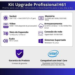 Kit pl mãe h61 + processador i3 2100 + memoria 8 gb ddr3 + cooler Este kit inclui: Processador intel para desempenho eficiente em multitarefas; Placa-mãe estável e confiável; Memória ram de alta performance; Cooler incluso para melhor refrigeração;