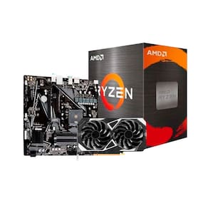 O kit inclui o processador Ryzen 5 5600X com cooler, uma placa-mãe A520M compatível e a placa de vídeo RTX 3050 6GB. Tudo embalado com segurança e pronto pra montar.