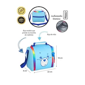 Lancheira: Confeccionada em Poliéster Isolamento térmico Alça de mão e de costas Alça que prende na mochila de rodinhas Design exclusivo Puxadores personalizados Fechamento em zíper Medidas aproximadas: Altura: 18 cm Largura: 8 cm Comprimento: 22 cm