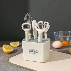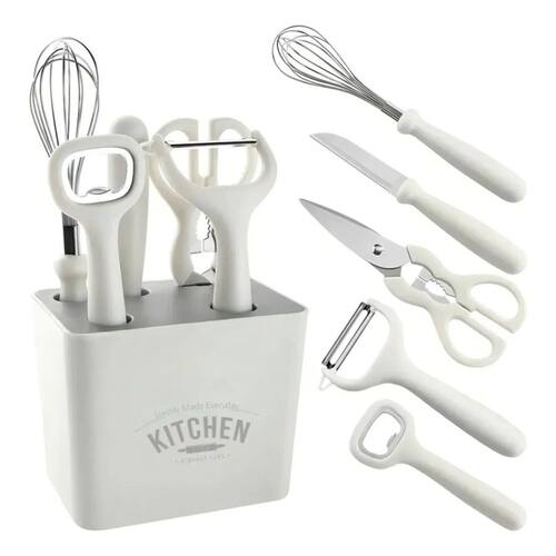O kit inclui ferramentas indispensáveis: uma tesoura multiuso ideal para cortes precisos, um batedor de claras (fouet) reforçado, um descascador de legumes eficiente, uma faca versátil e um abridor de garrafas ergonômico. Todas as peças são acompanhadas por uma base plástica compacta, que mantém os utensílios sempre à mão e organizados, ocupando pouco espaço na bancada. Com acabamento na cor branca (off-white), o conjunto apresenta um design moderno que se adapta a diferentes estilos de decoração de cozinha.