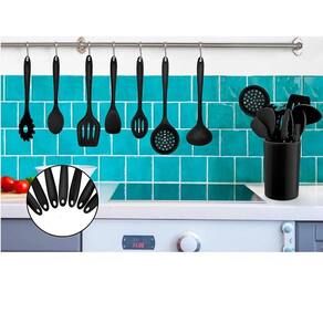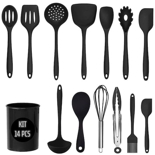Este kit de utensílios vai dar visual sofisticado e clean para sua cozinha.São compostos de utensílios em silicone de excelente qualidade e livre de bpa.São items de qualidade premiumO kit é composto por:- escumadeira - 32cm- concha - 30cm- espátula - 32,5cm- espátula vazada - 30cm- espátula pão duro - 26,5cm- espátula curva - 27,5cm- espátula - 21cm- colher vazada - 28cm- colher redonda de arroz - 24cm- pegador de massa - 29cm- pegador silicone e aço inox com trava - 27cm- batedor - 25cm- pincel - 21cm- copo escorredor