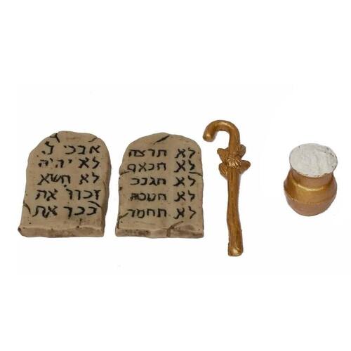 01 kit de utensílios da arca da aliança feitos em resina. 3 peças, contem: Tabua dos 10 mandamentos - 7 cm Mana - 3,5 cm Vara de arão - 9,5 cm Marca: Não Informado