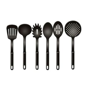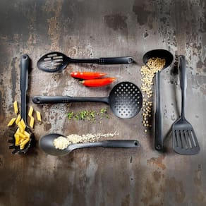 Kit Utensílios de Cozinha 5 Peças Cor: Preto Para um chef de verdade, utensílios de primeira Com este Kit 6 Utensílios de Cozinha, você terá em mãos as ferramentas perfeitas para dar asas à sua criatividade culinária. Chega de panelas arranhadas ou danificadas Esses utensílios feitos com plástico de alta resistência são seguros para panelas com revestimentos antiaderente e cerâmico, garantindo a durabilidade dos seus equipamentos de cozinha. Cada peça foi pensada para oferecer conforto e segurança no manuseio. Além de serem bonitas e modernas, as peças do kit são leves e ergonômicas, facilitando o preparo de seus pratos. Inove na cozinha com este kit completo O kit inclui: 1x Escumadeira 1x Espátula 1x Concha 1x Pegador de Macarrão 1x Colher de Arroz 1x Pegador de Saladas e Carnes Especificações Técnicas: Modelo: Kit 6 Utensílios de Cozinha Material: Plástico de alta resistência Temperatura Suportada: até 180 graus : 3 meses de contra defeitos de fabricação. Estamos confiantes na qualidade do nosso produto e queremos que você tenha a melhor experiência possível. Qual o material dos utensílios R: Os utensílios são feitos de plástico de alta resistência, seguro para panelas com revestimentos antiaderente e cerâmico. As peças podem ser utilizadas em qualquer tipo de panela R: Sim, as peças podem ser utilizadas em panelas com revestimentos antiaderente e cerâmico. Não recomendamos o uso em panelas de ferro ou aço carbono. O kit vem com quantas peças R: O kit vem com 6 peças: 1x Escumadeira, 1x Espátula, 1x Concha, 1x Pegador de Macarrão, 1x Colher de Arroz e 1x Pegador de Saladas e Carnes. Qual a do produto R: O produto tem de 3 meses contra defeitos de fabricação. Um verdadeiro chef merece ferramentas de qualidade Marca: Não Informado