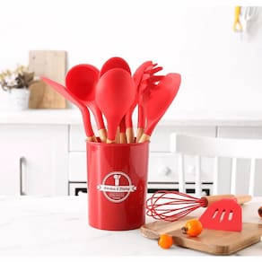 Kit utensílios de Cozinha de Silicone Kit Completo de Utensílios para Cozinha em Silicone que não danificam suas panelas e trazem total beleza para sua cozinha. O cabo de Madeira é bem rígido para ter segurança e praticidade no manuseio e preparo de receitas. Fácil de limpar e guardar. Conjunto excelente para o seu dia a dia.