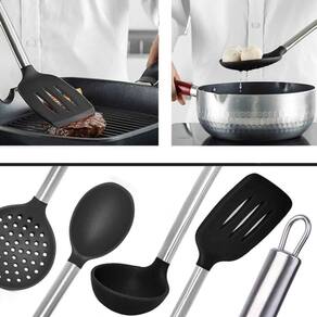 O Jogo de Utensílios para cozinha Unyhome é feito em silicone e metal super-resistente, proporcionando mais praticidade, segurança e requinte em suas refeições.