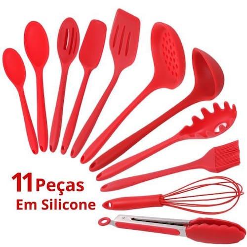 Conteúdo da embalagem: 11 utensílios de silicone na cor preta contendo: 01 colher pequena de silicone, 01 colher de arroz de silicone, 01 colher vazada de silicone, 01 espátula de pão duro de silicone, 01 espátula de fritura de silicone, 01 escumadeira de silicone, 01 concha para massa de silicone, 01 concha para feijão de silicone, 01 batedor de silicone e plástico, 01 pegador de silicone e inox, 01 pincel culinário de silicone.