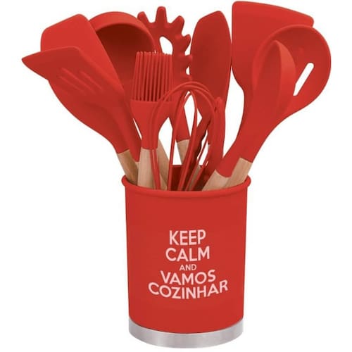 Kit Utensílios De Silicone Cozinha Com Cabo Madeira E Copo COR: VERMELHO Os utensílios que faltavam para sua cozinha ficar ainda mais completa ou para mandar bem naquele presente de chá de casa nova, chá de panela ou chá de cozinha, além do design lindo e diferenciado é firme e evita arranhões em suas panelas, perfeito para servir saladas, carnes, entre outros usos, disponíveis nas cores vermelho, verde, azul e rosa candy colors .