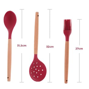 Kit Utensílios de Silicone Cozinha com Cabo de Madeira 8 Peças Vermelho