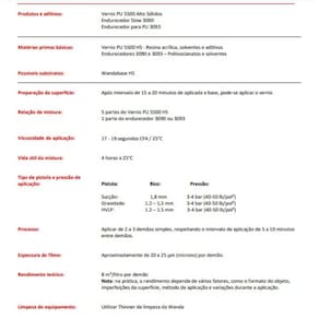 5 partes do Verniz PU 5500 HS1 parte do endurecedor 3090 ou 3093Processo: Aplicar de 2 a 3 demãos simples, respeitando o intervalo de aplicação de 5 a 10 minutos entre demãos.