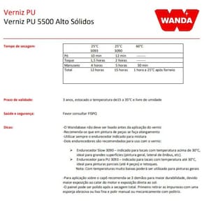 1 Verniz PU 5500 HS Wanda 750ml1 Endurecedor 3093 Wanda 150mlVerniz poliuretano de secagem rápida, indicado para acabamento final sobre Wandabase HS. Formulado para pequenos reparos e repinturas em geral. Possui alto brilho e durabilidade, secagem rápida, fácil polimento e excelente retenção de cor.
