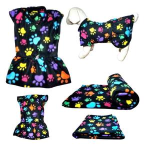Kit vestido e manta de inverno para cachorro. - os dois em tecido soft; - ótimos para aquecer seu pet em dias de frio; - cor: preto com patinhas coloridas; - vestido no tamanho: egg - manta no tamanho: g Medidas vestido - egg: Pescoço - 44 cm de circunferência; abdômen/tórax - 70 cm de circunferência; comprimento - 64 cm. Medida manta - g: 90 cm de largura x 145 cm de comprimento. Marca: Não Informado