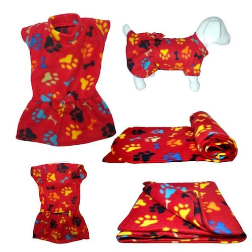 Kit vestido e manta de inverno para cachorro. - os dois em tecido soft; - ótimos para aquecer seu pet em dias de frio; - cor: vermelho com patinhas coloridas; - vestido no tamanho: egg - manta no tamanho: g Medidas vestido - egg: Pescoço - 44 cm de circunferência; abdômen/tórax - 70 cm de circunferência; comprimento - 64 cm. Medida manta - g: 90 cm de largura x 145 cm de comprimento. Marca: Não Informado