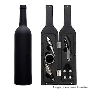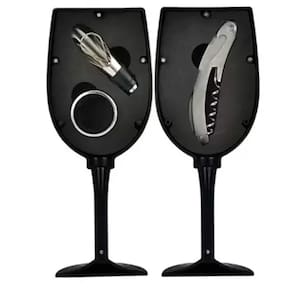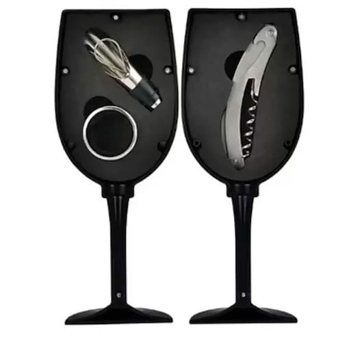 Conjunto de acessórios para vinho com embalagem em formato de taça. Uma ótima opção para você presentear seus clientes, colaboradores, amigos, etc.