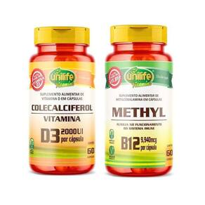 Kit com 1 un de Suplemento Alimentar Natural de Vitamina B12 Metilcobalamina Vegano 60 cápsulas 350mg e 1 un de Vitamina D3 2000 U.I. Colecalciferol 60 cápsulas de 470mg