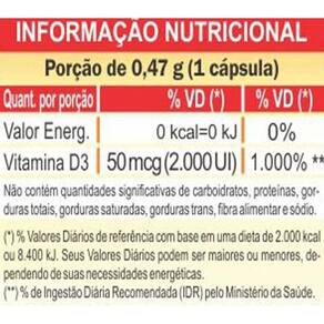 Ingredientes: Amido modificado e colecalciferol. Cápsula: gelatina vegetal e água.