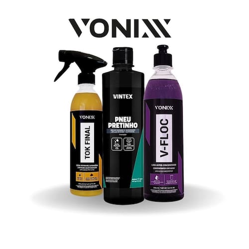 Kit vonixx brilho total - cuidado completo para seu veículo o kit vonixx brilho total foi cuidadosamente desenvolvido para proporcionar limpeza, renovação e brilho intenso à pintura, plásticos e pneus do seu veículo. Composto por três produtos de alta performance, este kit é ideal para quem busca resultados profissionais em casa, com praticidade e excelente custo-benefício. o que vem no kit: Shampoo automotivo neutro v-floc 500ml Função: limpa a lataria com eficiência, sem agredir a pintura ou remover ceras. Benefícios: ph neutro, alto rendimento, espuma densa e fácil enxágue. Intense renovador de plásticos internos 500ml Função: restaura o acabamento natural de painéis, portas e demais plásticos internos. Benefícios: toque seco, proteção uv, acabamento acetinado e durabilidade de até 6 meses. Pretinho vintex 500ml - brilha pneus Função: realça o aspecto dos pneus, oferecendo brilho e proteção. Benefícios: secagem rápida, aplicação prática e acabamento profissional.