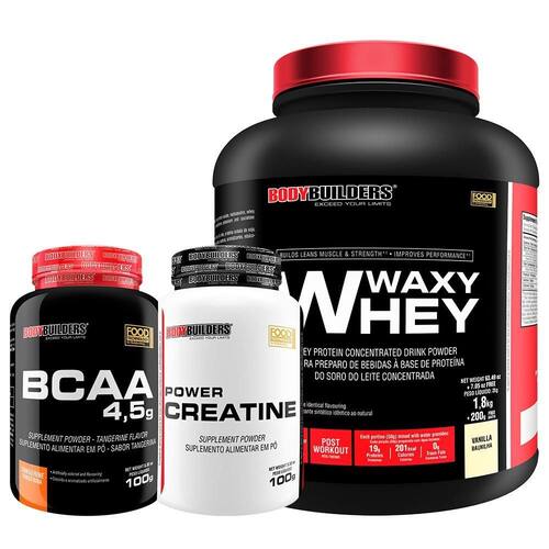 Kit waxy whey 2kg + bcaa 4,5 100g + power creatina 100g - bodybuilders sabor: baunilha kit composto por: 1x whey protein waxy whey - pote de 2kg 1x bcaa 4. 5 - pote de 100g, sabor tangerina 1x creatina - pote de 100g