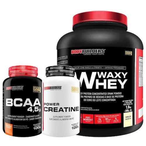 Kit waxy whey 2kg + bcaa 4,5 100g + power creatina 100g - bodybuilders sabor: baunilha kit composto por: 1x whey protein waxy whey - pote de 2kg 1x bcaa 4. 5 - pote de 100g, sabor tangerina 1x creatina - pote de 100g