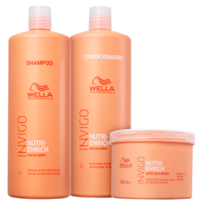 Kit de tratamento para cabelos secos, ressecados ou quimicamente tratados. Kit Wella Professionals Invigo Nutri-Enrich Salon Duo nutre e hidrata de maneira intensa através de uma fórmula tecnológica, rica em ativos que recuperam a fibra capilar.