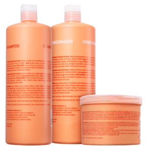 Aplique o shampoo sobre o cabelo úmido. Massageie suavemente e enxágue. Caso necessário, repita o procedimento. Em seguida, passe a máscara sobre o cabelo limpo e úmido. Distribua pelo comprimento e pontas dos fios e deixe agir por 5 minutos. Enxague. Depois, espalhe o condicionador no cabelo limpo e úmido, pelo comprimento e pontas. Deixe agir por alguns instantes e, em seguida, enxágue bem.