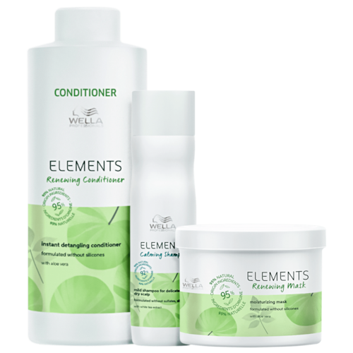 O Kit Wella Professionals Elements Calming + Renewing Trio Super Salon traz produtos com formulação de até 95% dos ingredientes de origem natural. Além de cuidar da saúde da fibra, também reduz e protege contra os danos perceptíveis, hidrata, nutre e equilibra. É dermatologicamente testado e sem silicones.