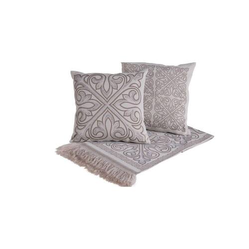 Quantidade de Peças e Medidas Aproximadas (Largura x Altura): 01 Xale decorativo 1,35 x 1,35 m; 02 Capas para almofadas 45 x 45 cm; 02 Refis de almofadas (enchimento) 45 x 45 cm.