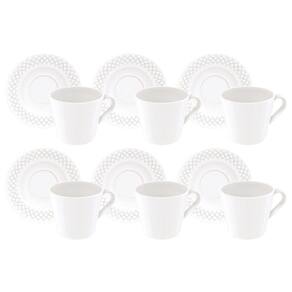 Fabricado em PorcelanaUso: Resistente a micro-ondas e lava-louçasPorosidade próxima de zero, evitando a proliferação de fungos e bactériasVolume da xícara:185mlComposição / Quantidade: 12 peças (6 xícara e 6 pires)