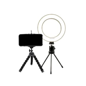 KIT Anel de iluminação Ring Light pequeno + tripé flexível universal de mesa para celular - perfeito para gravar vídeos youtube, toktok, instagra etc Ring Light Pequeno: O Ring Light é o produto ideal para você melhorar a qualidade de seus vídeos e fotos, a luz auxiliar de led ilumina seu rosto ou objetos de forma continua e complementa a luz ambiente, dando mais profissionalismo ao seu trabalho. Você pode ajustar o ângulo do anel por 360º, ajustar a temperatura de cor da luz, luz quente, suave ou branco frio, além de controlar a intensidade da luz entre luz baixa e alta. O Ring Fill Light é alimentado por cabo USB já integrado que pode ser conectado no celular, notebook, computador, adaptador de tomada com USB ou power bank. Incluso tripé que pode ser Utilizado para outros equipamentos de até 1Kg como celular requer adaptador , câmeras digitais etc. Características: - Cabo USB incluso - Tripé incluso - suporta até 1Kg - 360º - 3 temperaturas de cor de luz - 11 intensidades de iluminação - Fácil de usar, leve e durável - Não acompanha adaptador de tomada - Não possui bateria interna recarregável - Não possui suporte para celular Itens inclusos: - 1 anel de luz com cabo USB e controle - 1 cabeça de apoio 360º - 1 tripé Especificações técnicas: Diâmetro do anel: 16cm Alimentação: 5v - USB Comprimento aproximado do cabo: 180 cm Temperatura de cor: 3200k - 6000K ajustável pelo controle Regulagem de ângulo: 360º Potência: 10w Dimensões com tripé totalmente aberto: 22 x 28 x 22 - largura x altura x profundidade Dimensões do tripé fechado sem a cabeça: 14cm de altura Dimensões da embalagem: 16 x 19 x 4 Tripé flexível para celular: O tripé flexível de mesa para smartphone é o produto ideal para você gravar e assistir vídeos com conforto, praticidade e estabilidade, ele é leve, flexível, versátil, fácil de transportar e se adapta a qualquer superfície, podendo inclusive ser fixado em grades, galhos de árvores, pés de mesa e guidão de bicicleta, ele ainda serve como um pequeno pau de selfie. É o tripé perfeito para inovar na gravação de vídeos. Características: - Estável em qualquer superfície - Pernas revestidas com espumas duráveis - Ajustável 360º - Compatibilidade universal com smartphones que tenham até 8cm de largura - Compatível com câmeras com encaixe padrão ¼ - Funciona também como apoio parta tablets - Pode ser utilizado tanto na horizontal como na vertical Itens inclusos: - 1 tripé flexível - 1 cabeça adaptador para smartphone Informações técnicas: - Material: plástico, borracha e alumínio - Altura máxima: até 16cm - Tamanho total com o adaptador: 5 x 25cm - Peso: 130g - Suporta até 500g Aviso: - Não inclui câmera e/ou smartphone foto do celular/ smartphone apenas para ilustrar o funcionamento - Não inclui adaptador para Go Pro Aplicações: - Gravar vídeos para aulas, Youtube, TikTok, Stories Instagram e Facebook - Fazer Live / transmissão a - Assistir vídeos e fixar o celular em superfícies adversas ou planas Homologação Anatel: 097082111116