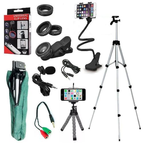 Kit youtuber microfone lapela + tripé 1,80m para câmera celular universal lentes suporte articulado extensão acessórios Kit youtuber com eletrônica Kit microfone de lapela + tripé 1,80m + acessórios O kit contém: 1 microfone de lapela 1 tripé de até 1,80m de alcance 1 bolsa para transporte 1 adaptador p2 1 cabo extensor de 3 metros 1 mini tripé para celulares acompanha suporte 1 kit de lentes olho de peixe wild, macro e fisheye 1 suporte articulado para celular O adaptador permite que o microfone de lapela seja utilizado em celulares ou em aparelhos que não tenham entrada para plug p2 de 3 vias. comprimento do cabo do microfone: 1 metro. comprimento do cabo extensor : 3 metros. Totalizando 4 metros. Aviso: em celulares nokia com o sistema operacional windows phone não funciona. Atenção a cor do mini tripé e do suporte articulado é escolhida aleatoriamente, conforme a disponibilidade em Homologação Anatel: 136132205567 Marca: Não Informado