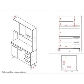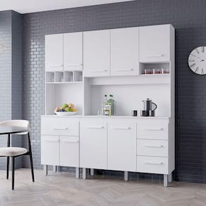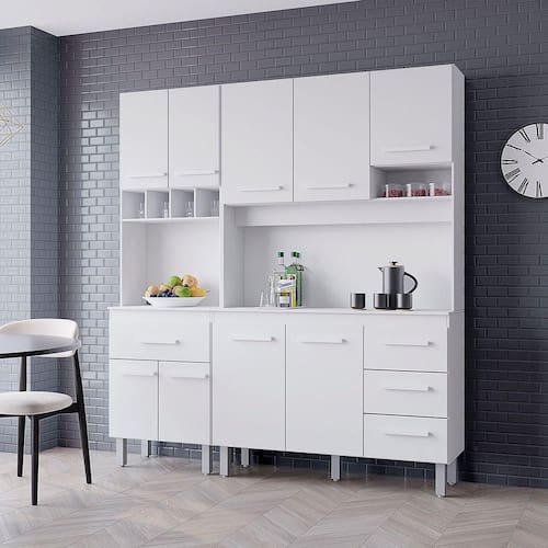 Este armário de cozinha compacto e funcional combina praticidade e organização. Possui armários superiores, balcão com portas e gavetas, além de nicho aberto para itens decorativos ou de uso frequente. Os puxadores são modernos e os pés elevados facilitam a limpeza do ambiente. Ideal para otimizar espaços menores com eficiência e estilo.Dimensões do Kit Vitória:Altura: 198 cmLargura: 118 cmProfundidade: 38/25,50 cmDimensões do Paneleiro Vitória:Altura: 197 cmLargura: 60 cmProfundidade: 38/25,50 cmCaracterísticas Técnicas:- Chapa MDP- Caixote 12mm- Portas e gaveta 15mm- Acabamento em pintura U.V- 09 Portas- 04 Gavetas- Dobradiças metálicas- Corrediças telescópica- Puxadores plástico- Pés com regulagem- Altura pé 16 cmDiferenciais do Kit Zínia:- Material da Estrutura: fabricado com MDP12/15mm- Detalhes do Kit: Dobradiças Reforçadas; Corrediças Telescópias; Puxadores Horizontais, finalizados com um excelente acabamento;Recomendações de limpeza:-Limpar com flanela limpa e seca. Não molhar o móvel e não expor em lugar úmido ou próximo de fontes de calor. Não usar produtos abrasivos.